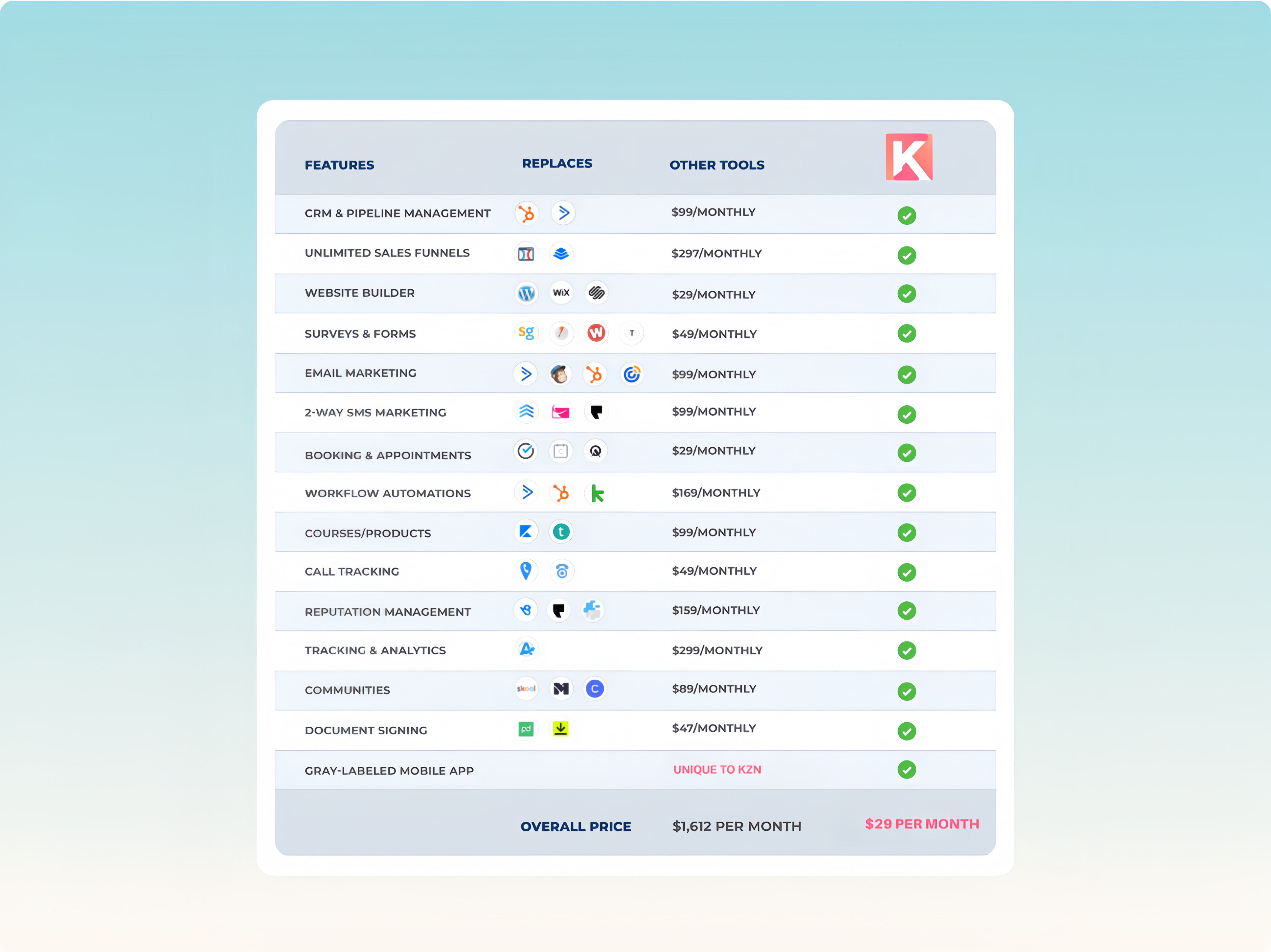 Kaizn is an all-in-one business platform that combines CRM, marketing automation, Email & SMS campaigns, landing pages, websites, memberships, and more…ALL at an affordable price!